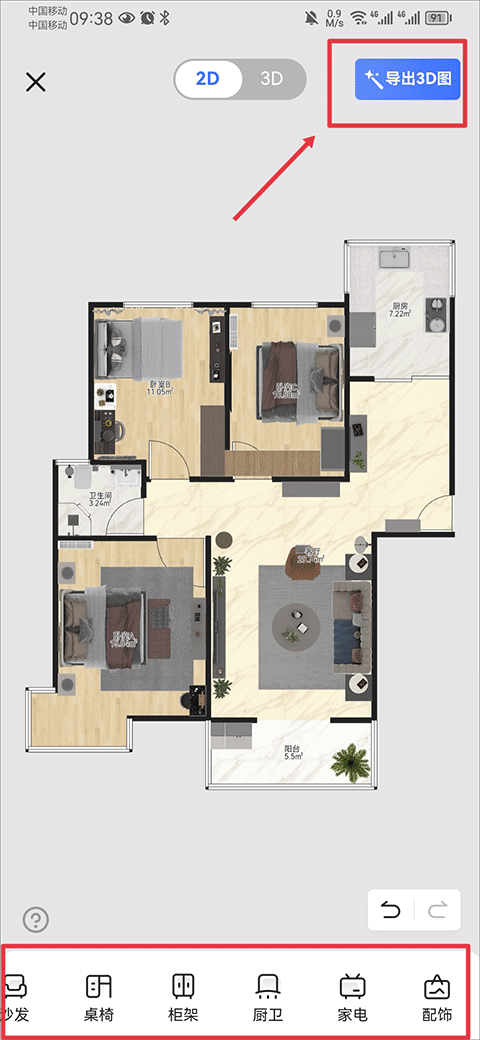 6、最后就可以使用下方菜单栏自定义自己的家啦,定制完成后点击导出3D图就可以啦