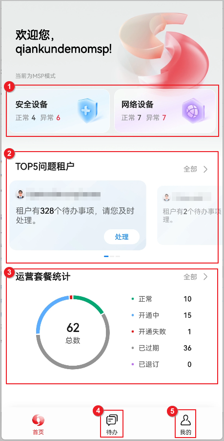 通过服务器“2nd.qiankun-saas.huawei.com(区域二)”注册的新用户,华为乾坤APP首页不展示“安全态势”功能。