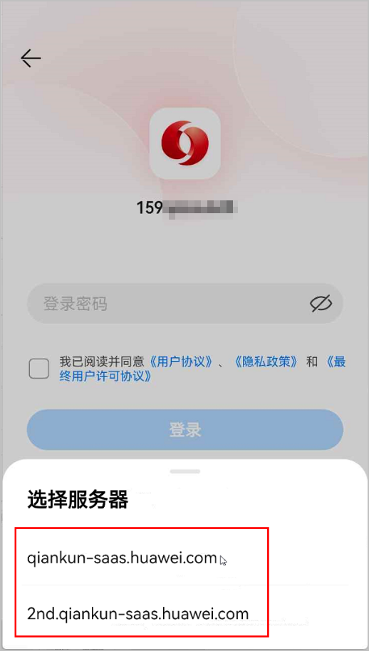已使用华为乾坤APP完成新用户注册,可以选择所在服务器地址,输入用户名+密码进行登录。