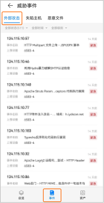 处置威胁事件:点击下方“事件”可切换至“威胁事件”界面。“威胁事件”界面根据事件的状态、时间、级别显示相应的信息,点击“威胁事件”名称可以对其处置。