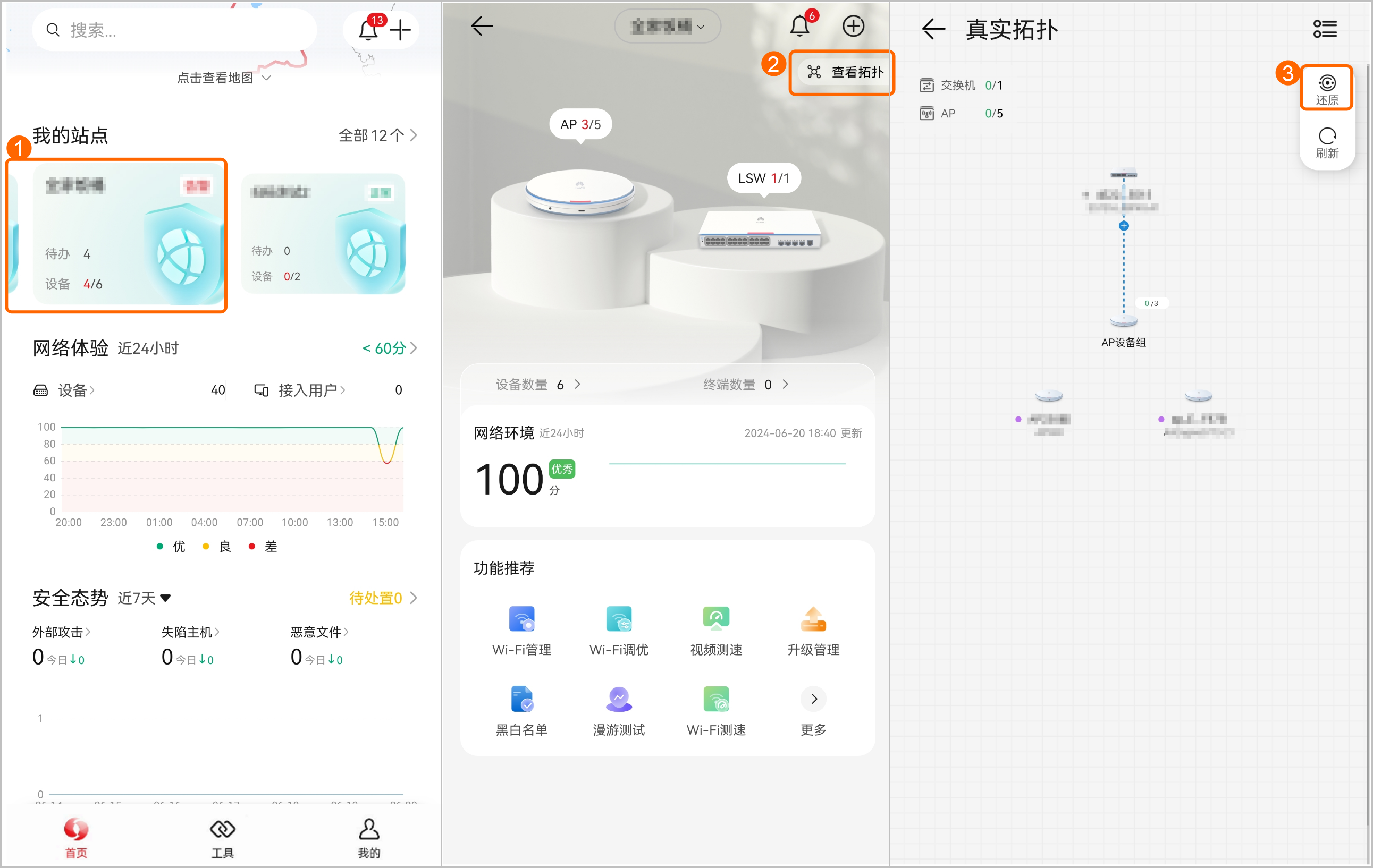 查看站点拓扑:在首页进入站点后,点击右上角“查看拓扑”进入设备的“真实拓扑”界面,可以直观的体现设备之间的连接情况。手指滑动可以放大和缩小界面,点击右侧“还原”按钮可还原至初始大小。