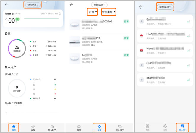 点击APP“首页”的“网络体验”进入网络体验的“概览”界面。点击“全部站点”可以切换站点,上方根据您选择的站点显示网络环境各评估维度的得分,下方显示设备信息和接入用户的信息。