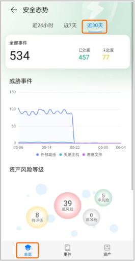 查看安全态势:点击APP“首页”的“安全态势”进入安全态势的“总览”界面。“总览”界面显示全部事件的数量,最多可以查看近30天内的威胁事件信息、资产风险等级、威胁事件类型。