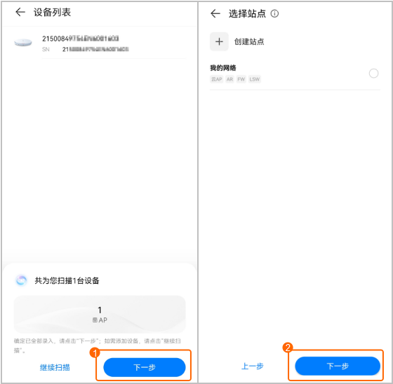 创建站点:当您确定已录入全部设备后,请点击“下一步”选择或创建站点,默认站点名称为“我的网络”,直接点击“下一步”会创建默认站点。