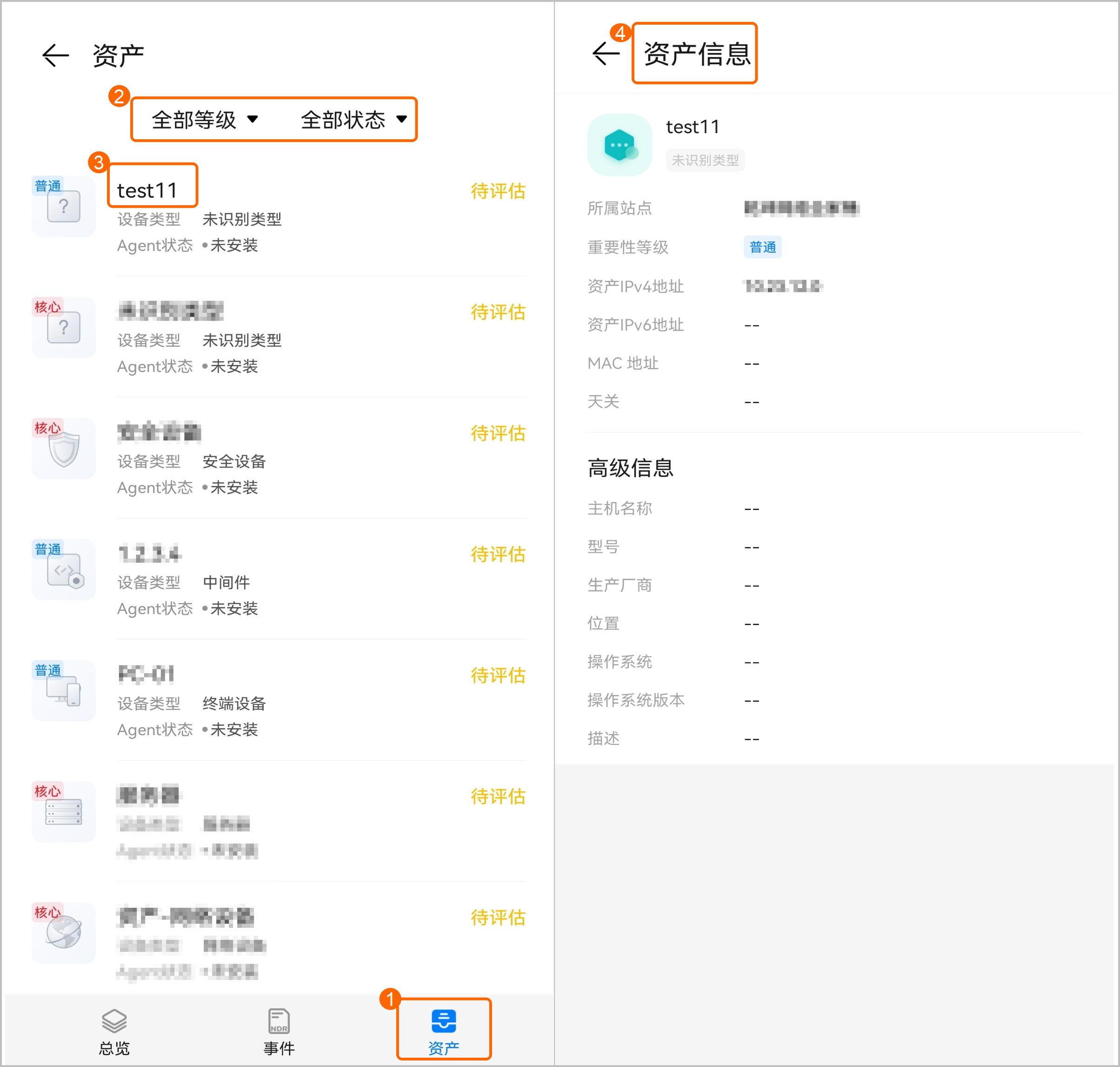 查看资产:点击下方“资产”可切换至“资产”界面。“资产”界面根据资产的等级和状态显示相应的信息,点击具体的资产名称可查看资产具体信息。