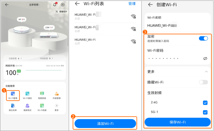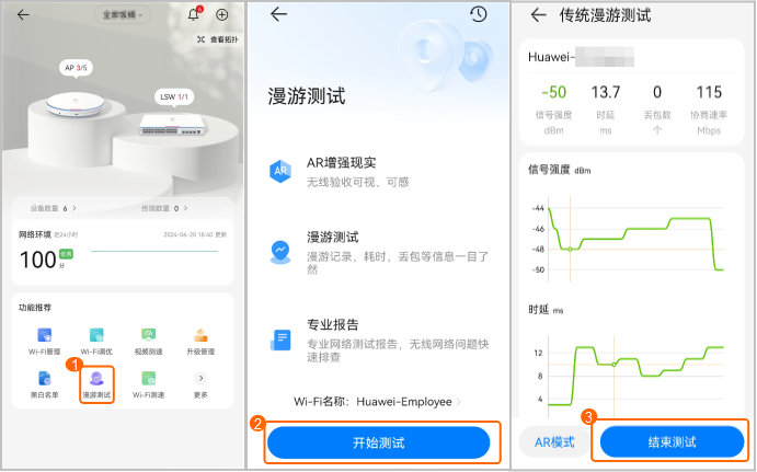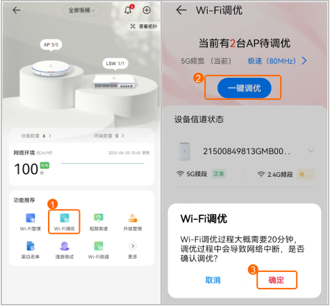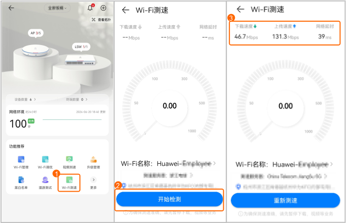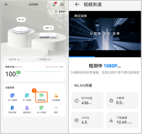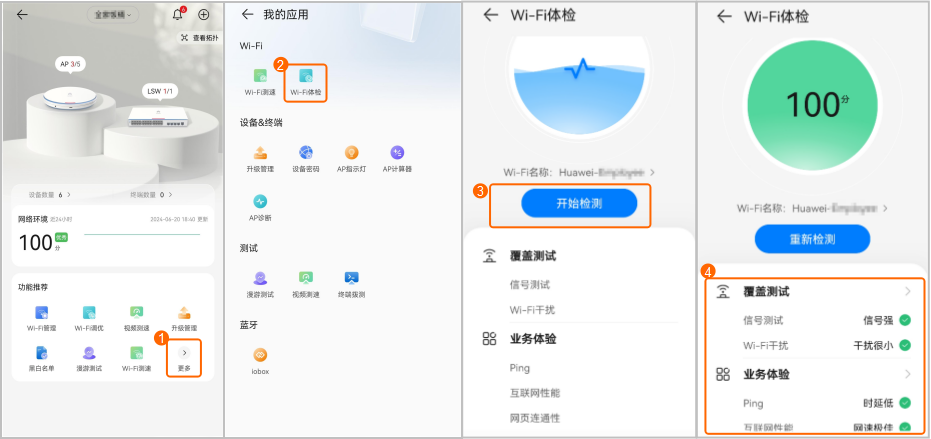 Wi-Fi体检:从覆盖测试、业务体验、网络安全维度全面评估Wi-Fi的使用体验,并提示用户当前Wi-Fi可优化项。