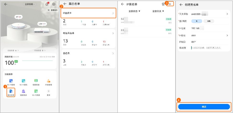此处以创建“IP黑名单”为例,“域名黑名单”和“白名单”操作方法与创建“IP黑名单”相近,可以参考创建“IP黑名单”。