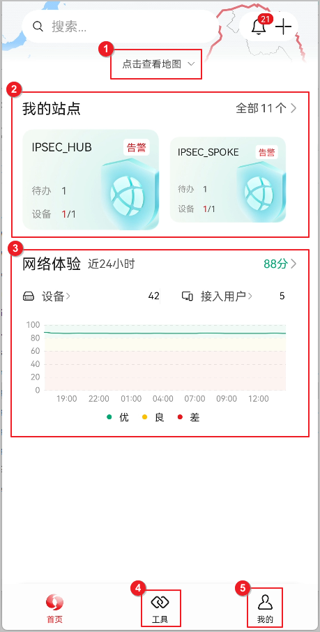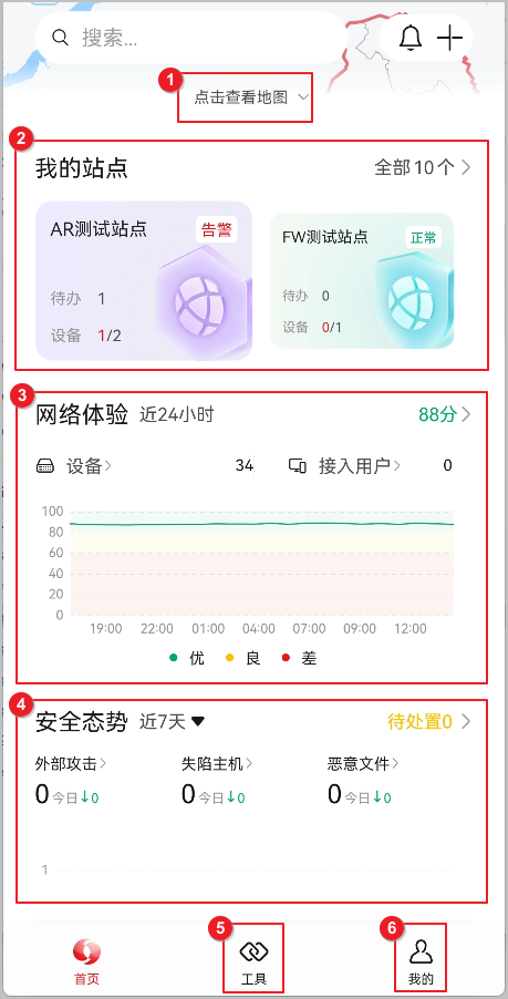 | 1 | 点击查看地图:直观显示各站点的设备数量和安全信息。 |