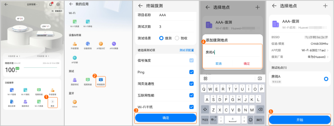 终端拨测:测试某个地点的Wi-Fi综合性能指标,包括信号强度、时延、网页连通性,互联网性能(上传/下载的速度)、Wi-Fi干扰等。