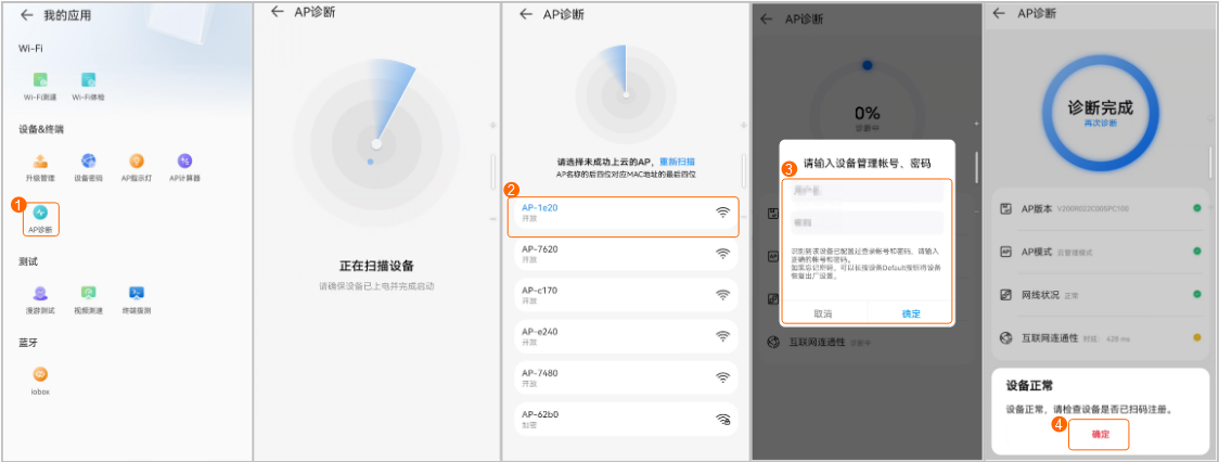 AP诊断:对未上云AP进行诊断,如果诊断结果是设备正常,您可以扫描设备上云,如果异常请根据提示修复。