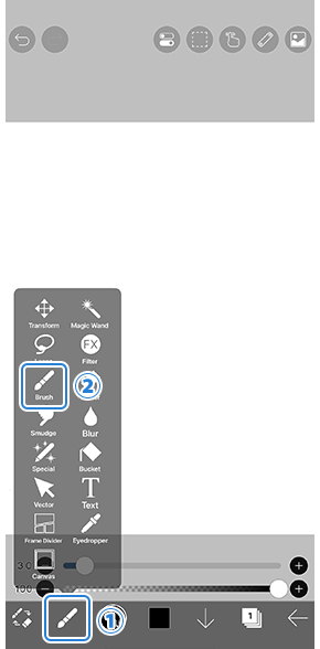 选择 ②[ 画笔工具 ] 通过 ①[ 工具选择按钮 ].这样,画笔工具现在就可以使用了。