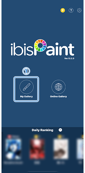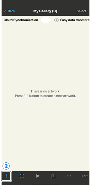 此屏幕是 我的图库。起初,没有图稿,但您的图稿将在此屏幕上排成一排。点击②[ 创建新画布按钮 ] 创建新画布。