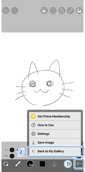 当您想要停止绘图时,请点击 ①[ 返回按钮 ] 并选择②[ 返回我的图库 ]。这将带您返回我的图库屏幕。