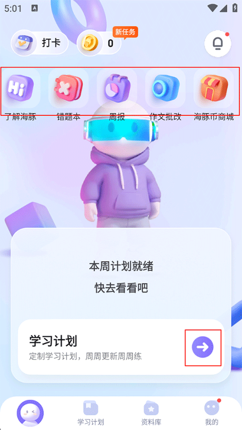 1、打开海豚AI学APP,首页提供了错题本、周报、作文批改和海豚商城等功能,点击下方的学习计划还可进入调整学习规划;