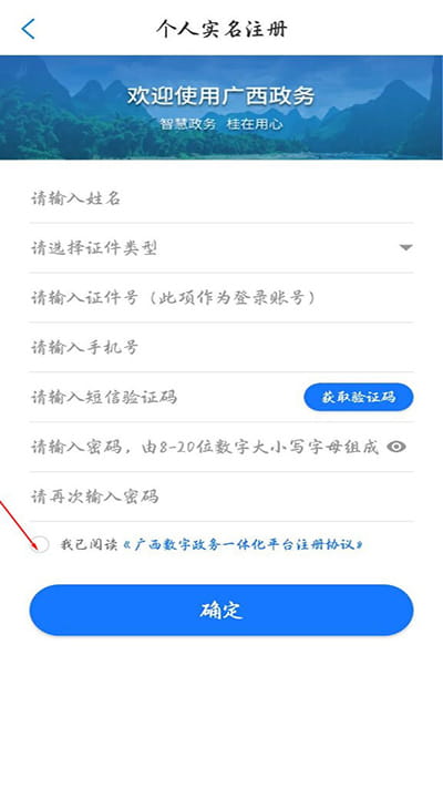 3、进入页面后,输入对应的个人信息,勾选协议点击确定即可注册成功。