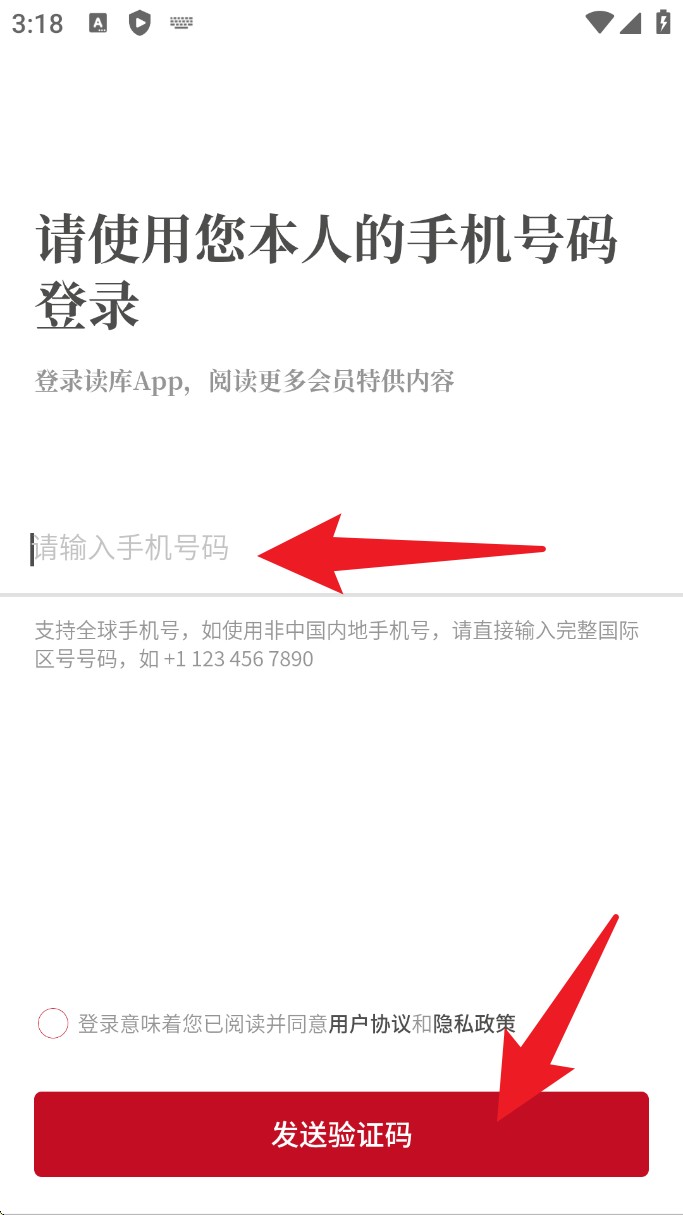 1. 打开应用后,在登录页面输入本人手机号,勾选同意用户协议和隐私政策,再点击“发送验证码”完成登录。