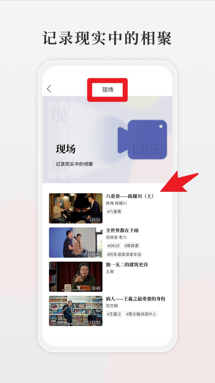 5. 进入“现场”栏目,可以观看各类深度访谈与活动视频,随时回顾精彩的实时相聚内容。