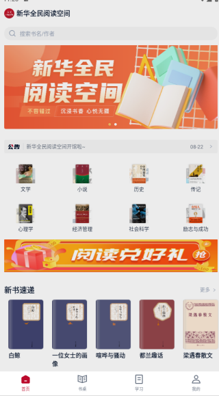 1、在首页,用户可以查看各种书籍专区,及时在线挑选。