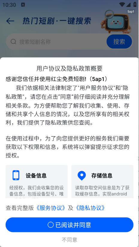 1、用户首先在精品网下载红尘免费短剧app,查看并同意隐私政策与用户协议。