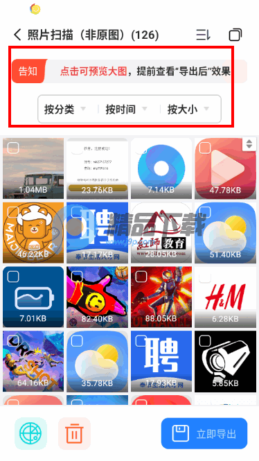 多场景支持与预览覆盖手机相册、微信、QQ等主流平台,兼容JPG、PNG、RAW等多种格式,扫描后支持高清预览,用户可筛选后批量导出,避免无效恢复,提升效率。
