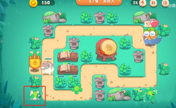4、第四波大萝卜放在正下方放火炮的地方,这个位置是本次关卡里面重要的地方,机关被冻住的时候可以快速进行清理,左侧障碍也靠这个火炮清理。