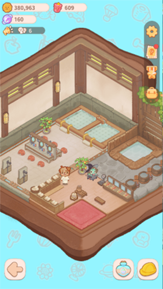 你的任务就管理这家旅店,休息室,温泉室还有餐厅,赚取更多的小饼干,让这旅店装修得更好。