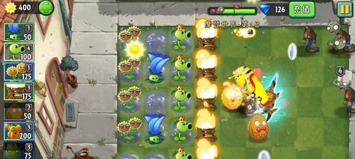 然后是豌豆射手+火炬树桩,玩家们也可以尽可能选择多的豌豆射手,再搭配上一行的火炬树桩,攻击力增强。还有前排记得配合上玉米投手,能够延缓僵尸进攻速度。