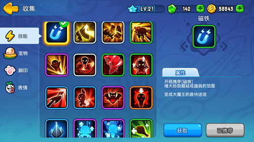 三、磁铁(被动技能):这个技能推荐新手作为出门技能,有些新手吃蘑菇效率太低,游戏快结束了都还没有满级。或者中途加入比赛时间不多了,带上磁铁都能帮你快速升到满级。