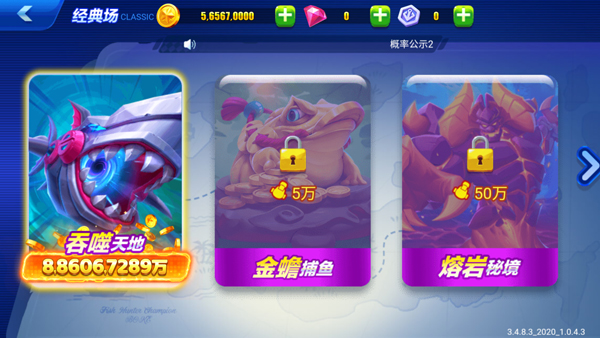 本模式包含新手渔场、金蟾捕鱼、哪吒闹海、三国争霸、失落神殿,随着玩家等级的提升而不断解锁新的场景模式。