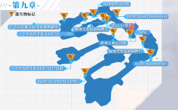 2、【胜利女神设计图】光点(遗失物品)的位置在下图所示处,第九章地图下半部分左侧拐角处,其实就是传送门出来往右走一点的坦克废墟旁(9-15前)。