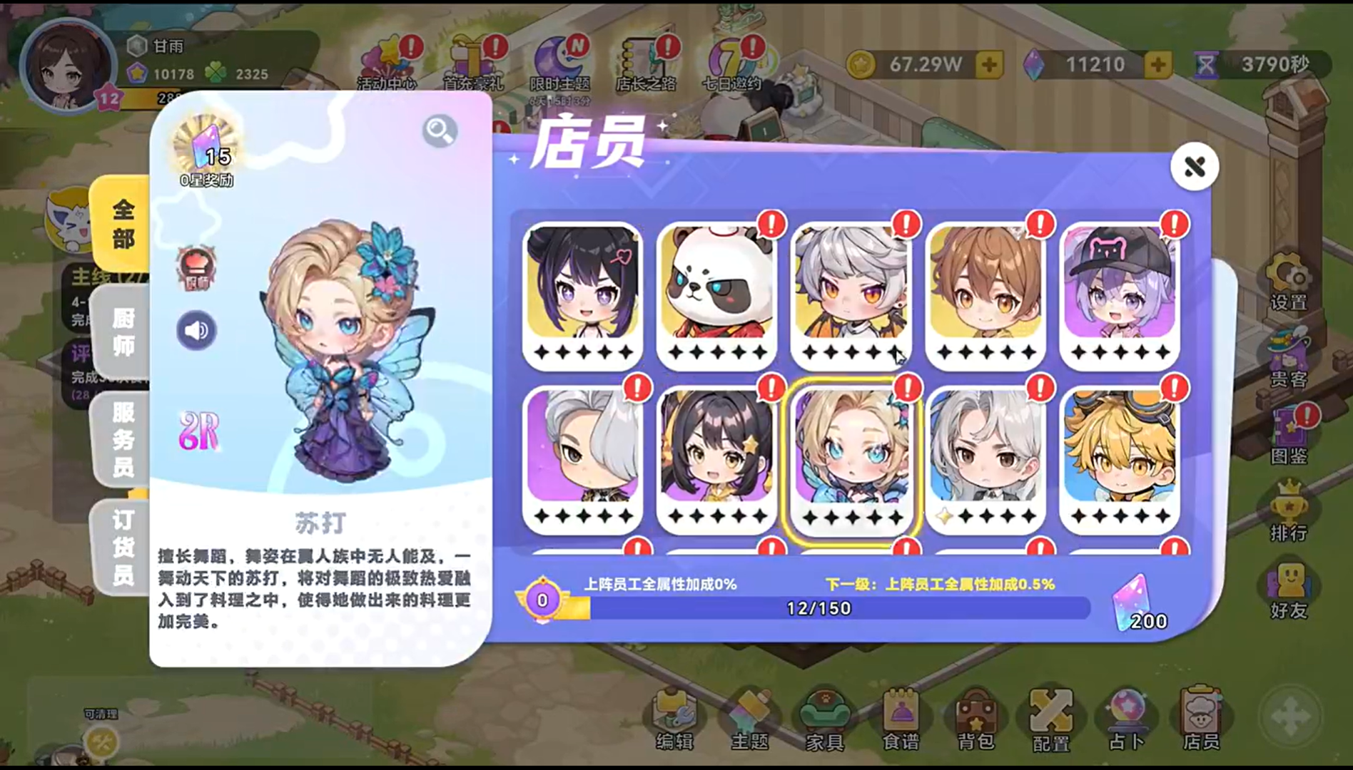 技能搭配:每个店员都有独特的定位与技能,玩家需合理搭配店员队伍,让酒吧、魔法温室、订购法阵等场所全速运转,提升餐厅整体运营效率。