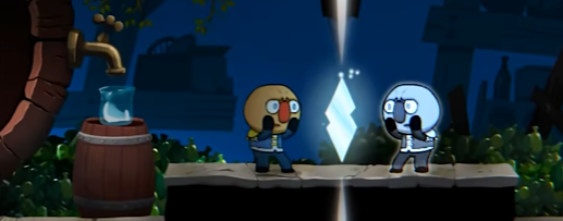 第五大关的则是可以移动一些镜像世界的物品,帮助解谜,boss站则也是利用这个原理移动杯子,让boss喝酒晕倒。
