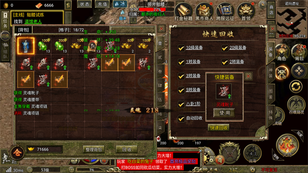 2、成长与装备获取:提供多样化的角色成长路径,包括装备强化、技能修炼、神将招募等。装备按品质分为白、绿、蓝、紫、橙五等,玩家可通过击败BOSS、完成副本等方式获取极品装备。此外,还有无尽BOSS争夺、神将招募等玩法帮助玩家获取资源。