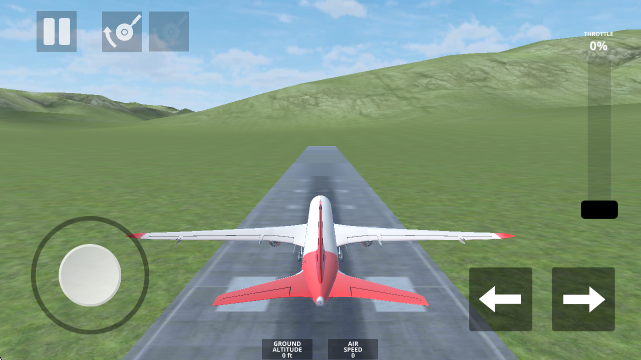 6:进入游戏后,通过虚拟摇杆和按键操控飞机,右侧“THROTTLE”可调节油门控制飞机速度,左右按键控制飞机方向,下方显示“GROUND ALTITUDE(地面高度)”和“AIR SPEED(空速)”等数据。