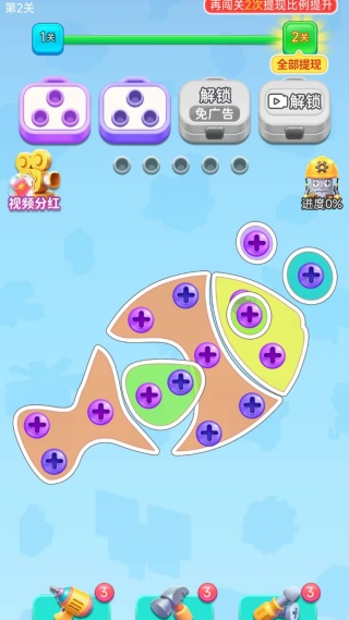 拧螺丝操作:玩家需要通过点击屏幕来控制工具拧动螺丝,将螺丝从物体上拧下。每个关卡都有多个螺丝等待玩家去拧,只有将所有螺丝都成功拧下来,才能进入下一关.