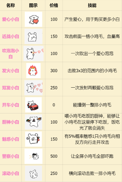 4、首先种植抱着爱心的小白,它会持续产出“爱心”,功能类似阳光,可用于购买与部署其他类型的小白,值得一提的是,敌方小鸡毛不再“吃植物”,而是通过“舔”小白的方式来消除防御,趣味十足。