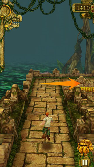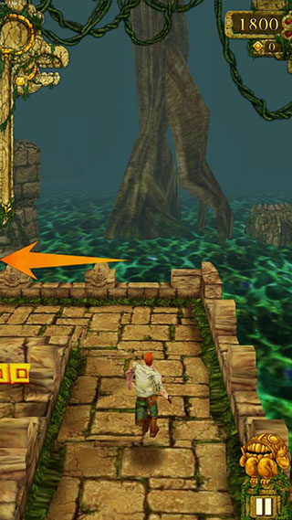1、人为撞墙。这个方法简单,如上图,在确定前方无障碍物的情况下,滑动手指撞击墙壁,怪物出现,速度也会随之减慢,等怪物消退后,重复操作。 但是注意,无论被哪种方式绊倒后均有一定的“无反应时期”,就是说在前方有障碍物的情况下,不能使用该种方法(下面2,3方法同理)。在人为撞墙之后,立即点击跳跃是没有反应的,只能眼睁睁的掉下去。
