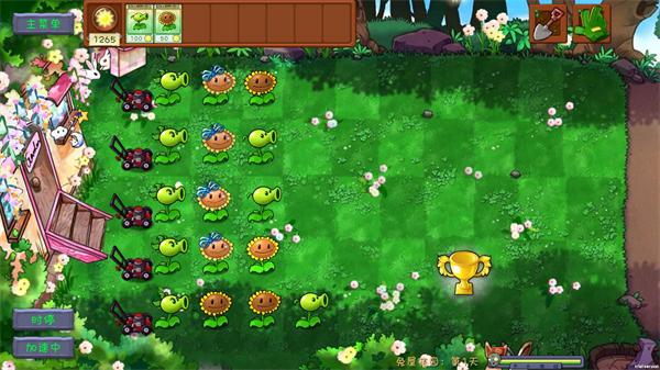 8、关卡的进度在右下方显示,当消灭所有僵尸后就可以通关,通关可以获得金币奖励,有些关卡则会给新的植物。