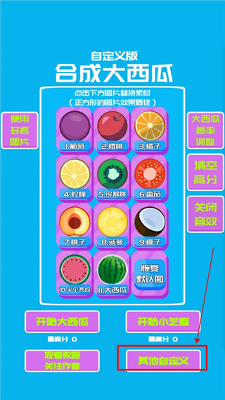 5、进入后可以在这里调整下落速度,反弹力度,初始旋转,失败时间和西瓜文字的替换;