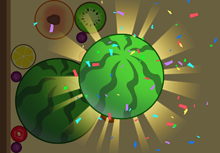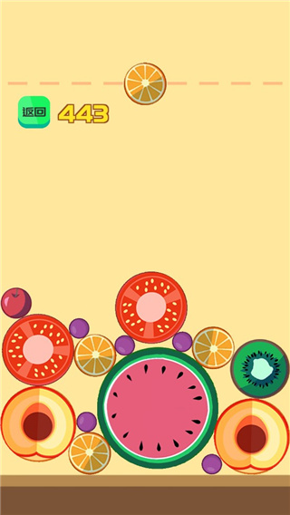 2、一开始玩建议大家有序的排列水果,遵从一个角落水果最大,越往外水果越小的感觉(类似2048),这样容易产生连续合成而节约空间。而且一旦大水果在中间很容易堆太高导致游戏失败。