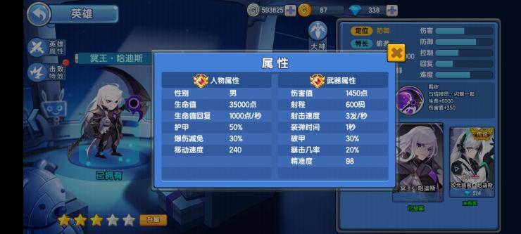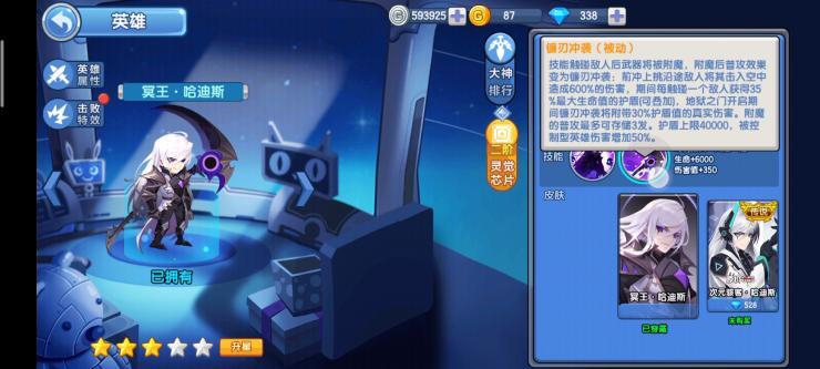 点击英雄进入英雄展示面板,可以查看英雄属性特征和技能效果等。