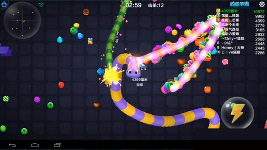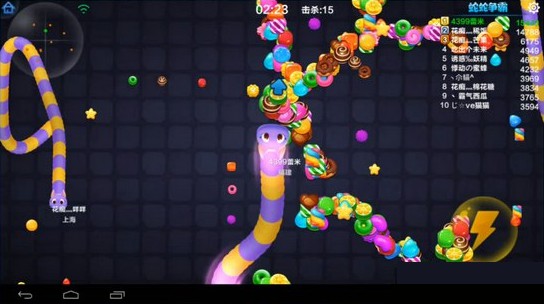游戏里经常出现群蛇混战的局面,你可以跟随一条大蛇的尾巴前进。等大蛇死掉后立马吃掉尸体变成的大糖果。