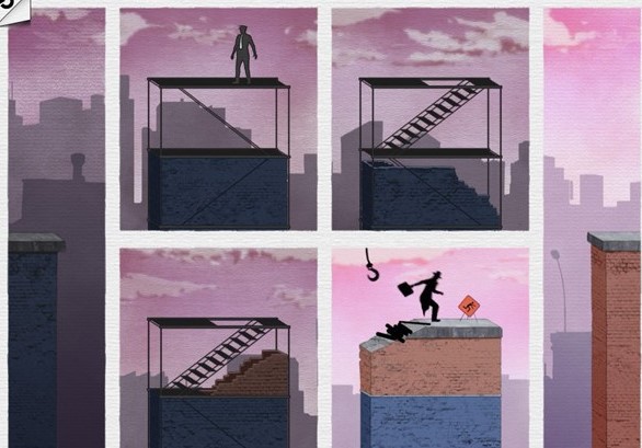7、不过我们能够做的唯一一件事就是想方设法让主人公不要走到那块破损的墙壁。方法也很简单,如下图所示调转3、4、5图片的位置即可。这样做有两个好处,一来是主人公在警察上方走过避开了警察的视线,二来直接利用水管滑至下一层而不用去受豆腐渣工程建造商所害。一举两得啊有木有!