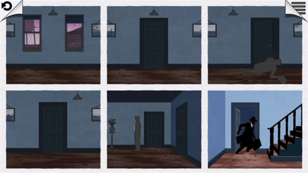 3、随后来到了第三个场景,倒霉的主人公在众多的房间当中穿梭,却不料RP不好,乱了阵脚,被守株待兔的警察给逮了个正着……如果我们按照下图移动插画的位置,主人公的RP爆表,错过了警察之后便可以从楼梯逃走。小编也不知道怎么回事,自从玩了致命框架攻略之后也忍不住站在了我们的主人公这边,明知与警察作对实则不对,却还是忍不住为逃过一劫又一劫的黑衣人拍手叫好。