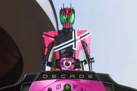 假面骑士Decade拥有多种形态,基础形态使用“Decade驱动器”配合骑士卡片变身,能自由穿梭平行世界并变身为其他骑士;