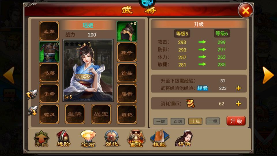 1、武将升级:消耗经验,升级武将,等级越高,战斗力越强;