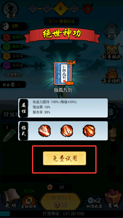 少侠好剑攻略能帮你轻松畅玩这款武侠题材的火柴人闯关游戏。它有清晰直观的角色面板,让你随时掌握角色等级、属性、装备与战力详情。丰富副本层层解锁,从新手村到高难关卡,带来持续挑战与丰厚奖励。经典武侠元素重现,像九阳神功、辟邪剑谱等心法任你修习。还有深度心法与装备系统,强化武器装备,通过心法搭配提升战斗策略性。新手进入游戏,选随机出身并强化随机可免费得SSR级初始资源。战斗时自动挂机,点击怪物能加速攻击。通关获取金币奖励后,可进入装备合成系统打造强力装备。不管是单人闯关还是排位赛,都能提升战力,体验竞技快感。多样挑战模式持续更新,水墨风美术与放置合成玩法结合,带你重温江湖梦。