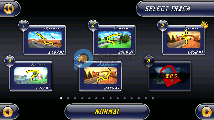 4. 游戏有各种专业赛道,虽不长但七弯八拐有挑战性,3D卡通画面较出色,飙车快感足,还有强劲摇滚乐。