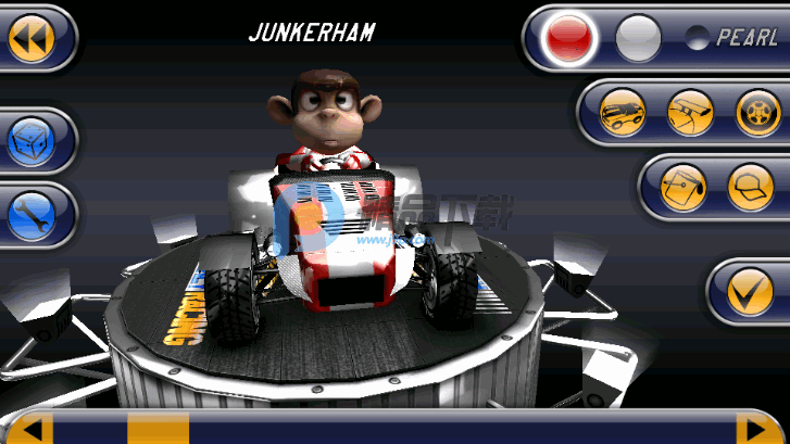 4、无需解锁赛车,在准备界面点击骰子可随机变换赛车与猴子造型,游戏有80多条赛道数个场景关卡,解锁守关赛道有特定条件。
