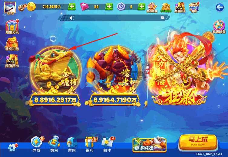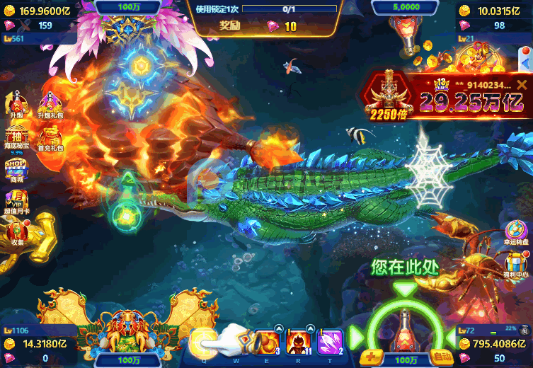 倍率调整:玩家可根据目标鱼类的价值,灵活调整炮台倍率。高倍率炮台虽然消耗更多金币,但捕获高价值鱼类时,收益也更为丰厚。例如,将倍率提升到2倍,玩家射出的6级炮将消耗12个金币,同时,捕捉到的鱼也会获得两倍的金币奖励。